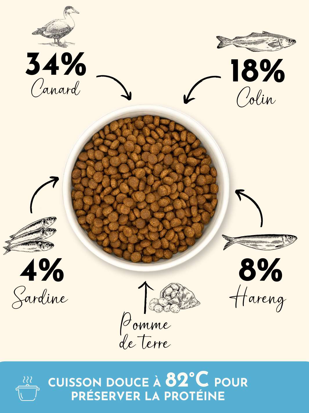 Canard, sardines, colin, hareng : des protéines digestes et savoureuses, sélectionnées avec soin.