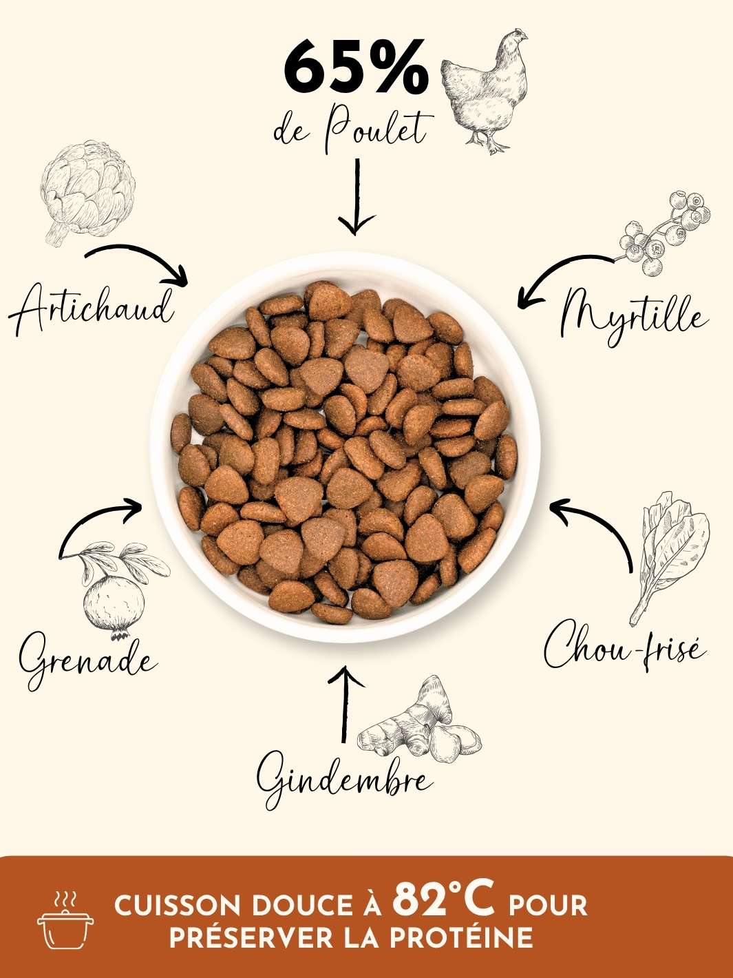 65 % de poulet (35 % de poulet d’élevage en plein air fraîchement préparé, 22 % de poulet séché, 6 % de graisse de poulet, 2 % de sauce de poulet), patates douces, haricots, pulpe de betterave, gingembre, grenade, chou frisé, artichaut, myrtille.