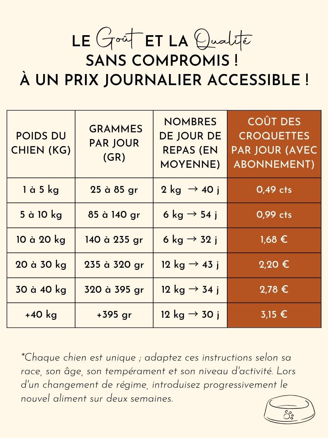 POIDS DU CHIEN (KG) | GRAMMES PAR JOUR (GR) |