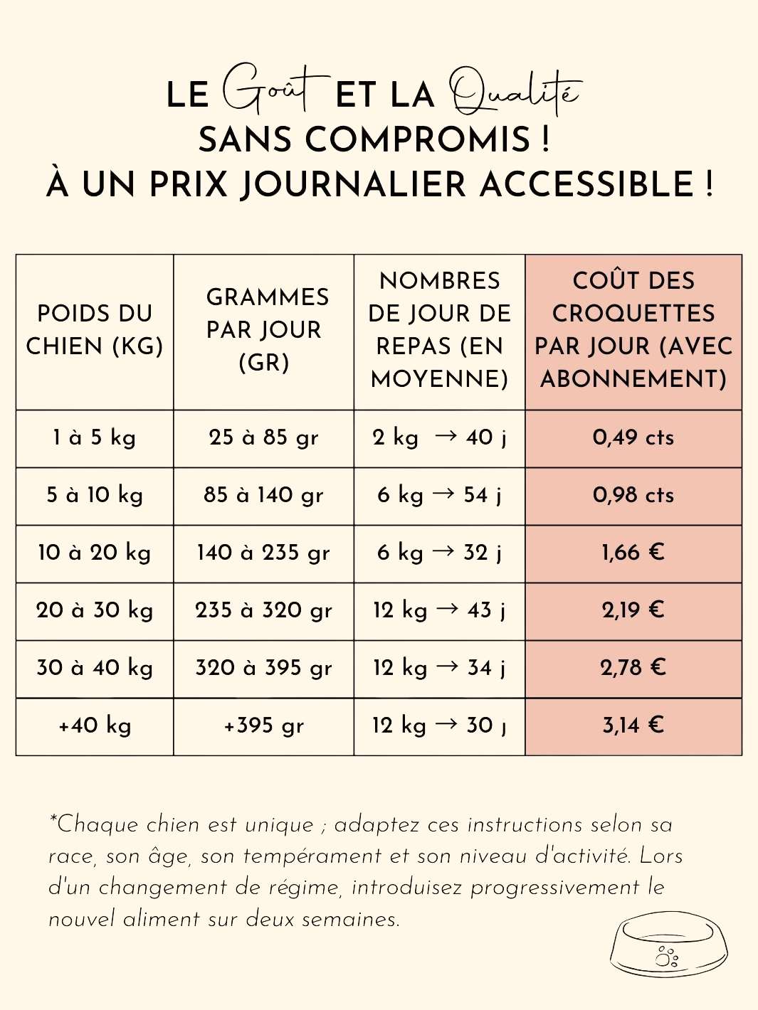 POIDS DU CHIEN (KG) | GRAMMES PAR JOUR (GR) |