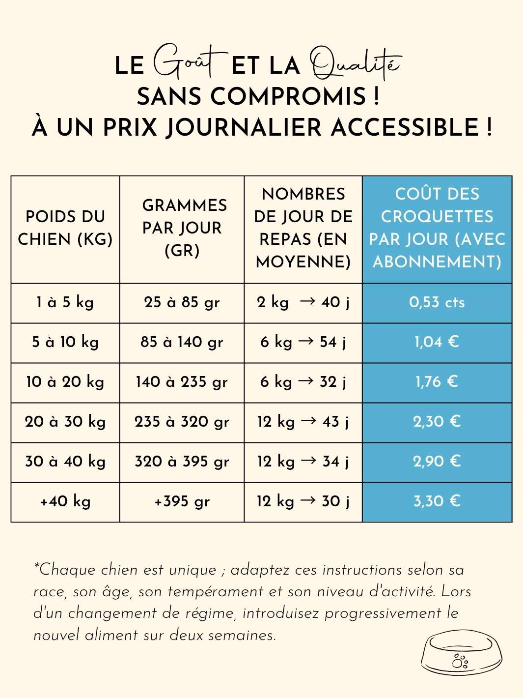 POIDS DU CHIEN (KG) | GRAMMES PAR JOUR (GR) |