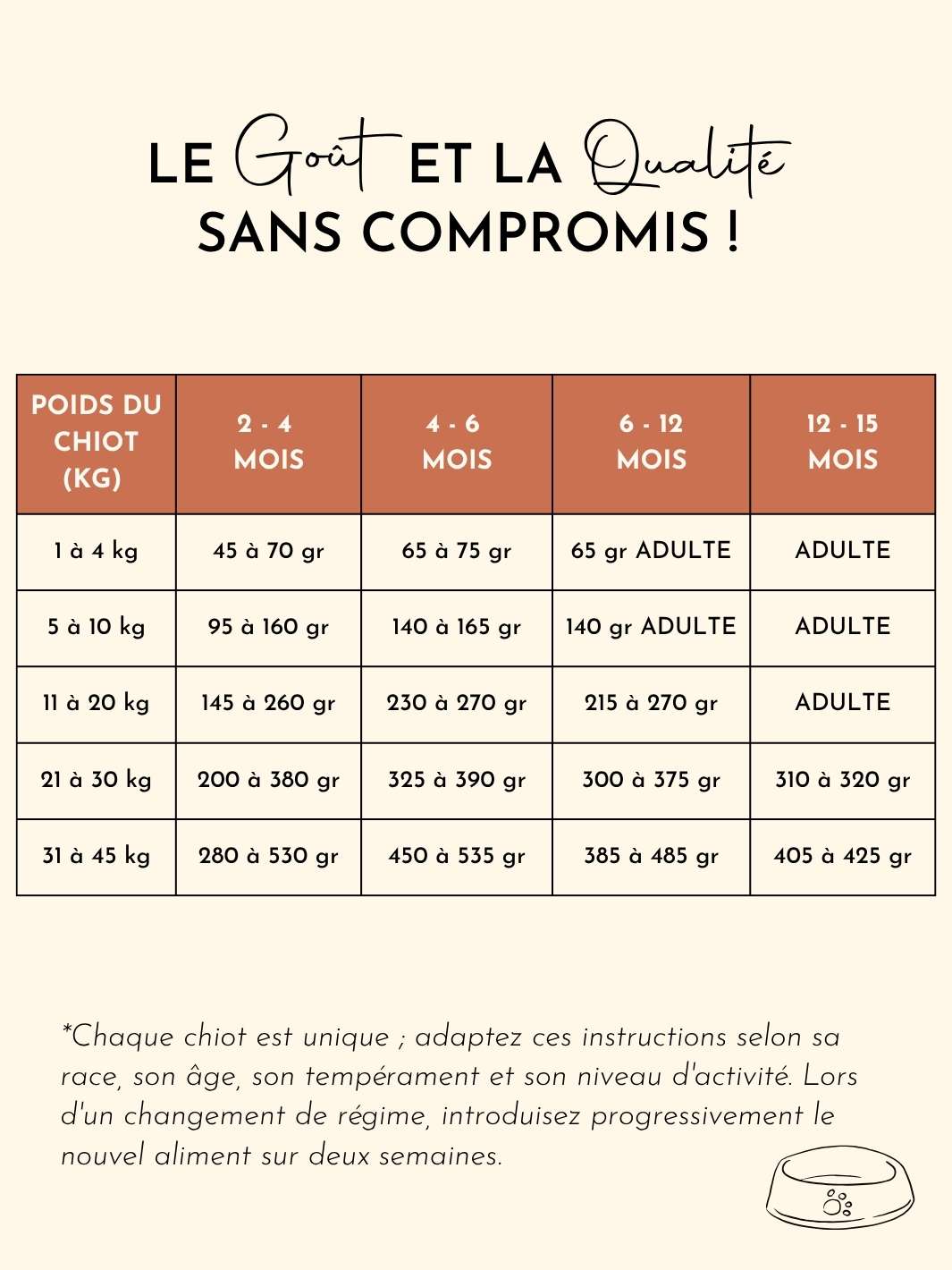 POIDS DU CHIOT (KG) | 2 - 4 MOIS | 4 - 6 MOIS | 6 - 12 MOIS | 12 - 15 MOIS |