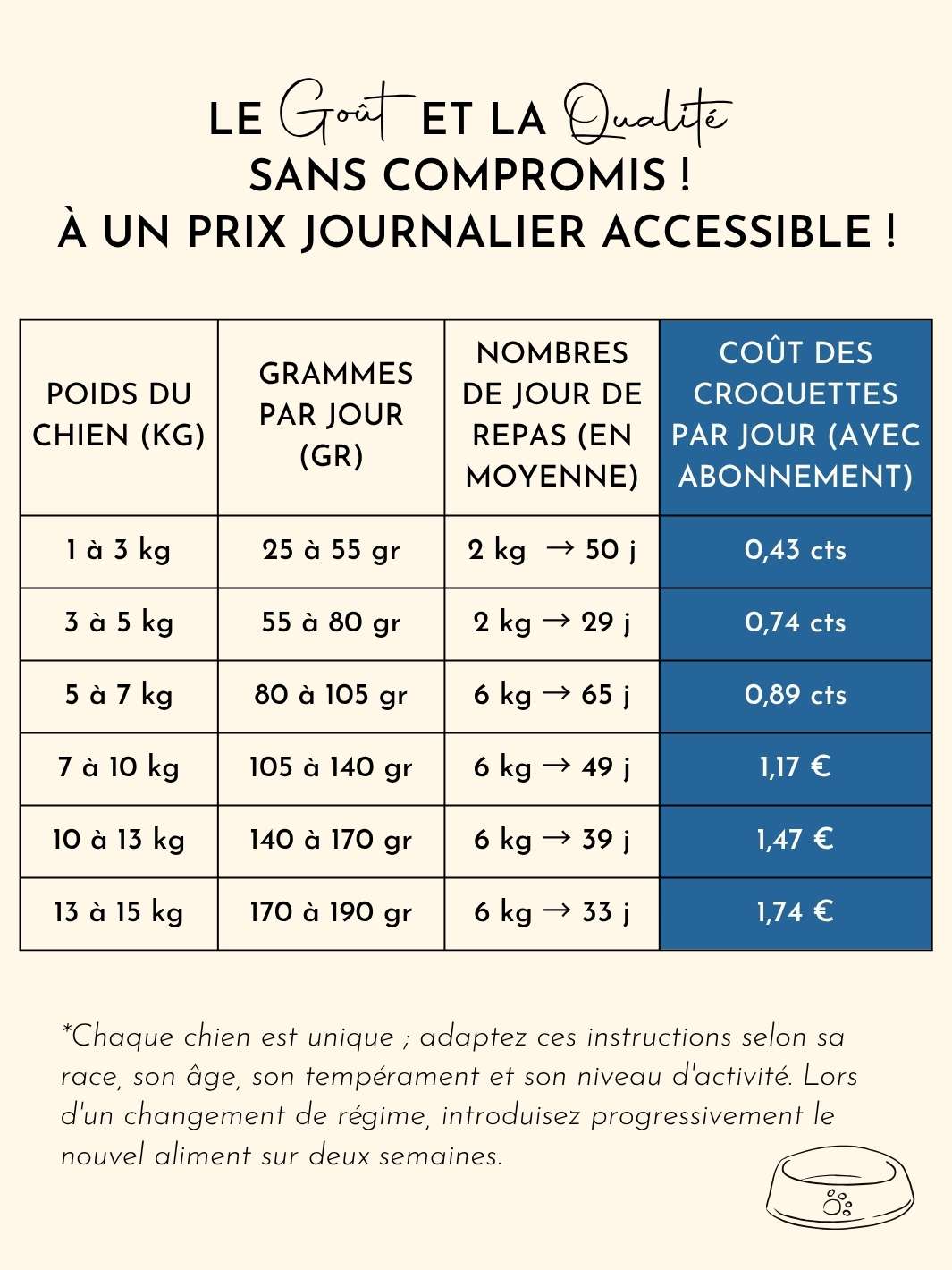 Tous les chiens sont différents, et ces instructions doivent être adaptées en tenant compte de la race, de l’âge, du tempérament et du niveau d’activité de chaque chien. Lorsque vous changez l’alimentation de votre chien, veuillez introduire le nouvel aliment graduellement sur une période de deux semaines.