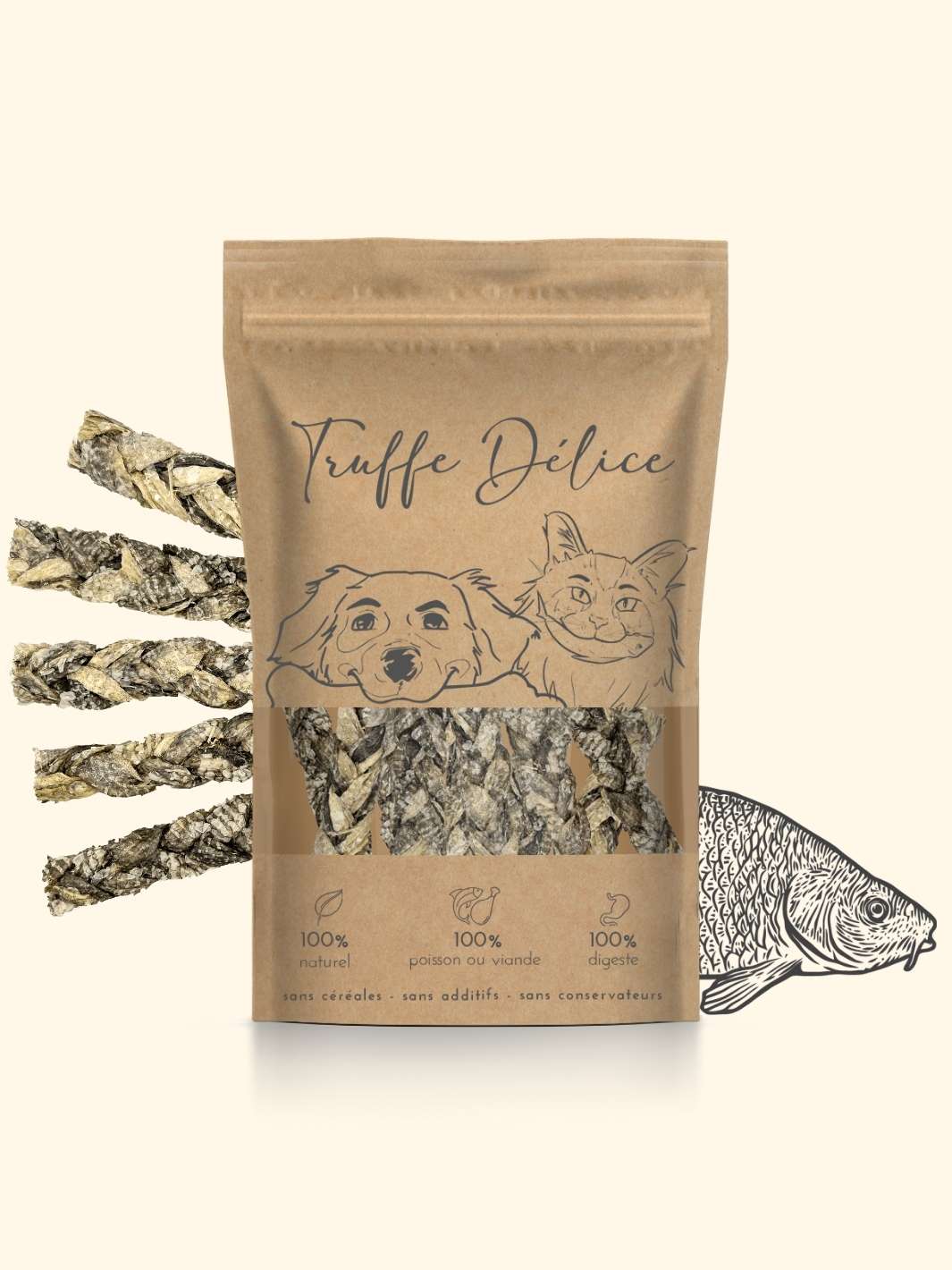 Ces friandises sont de savoureux en-cas que vous pouvez donner à votre toutou et/ou matou entre ses repas. La tresse de peau de morue occupera votre boule de poils et lui apportera tous les bienfaits nécessaires à sa bonne hygiène de vie.