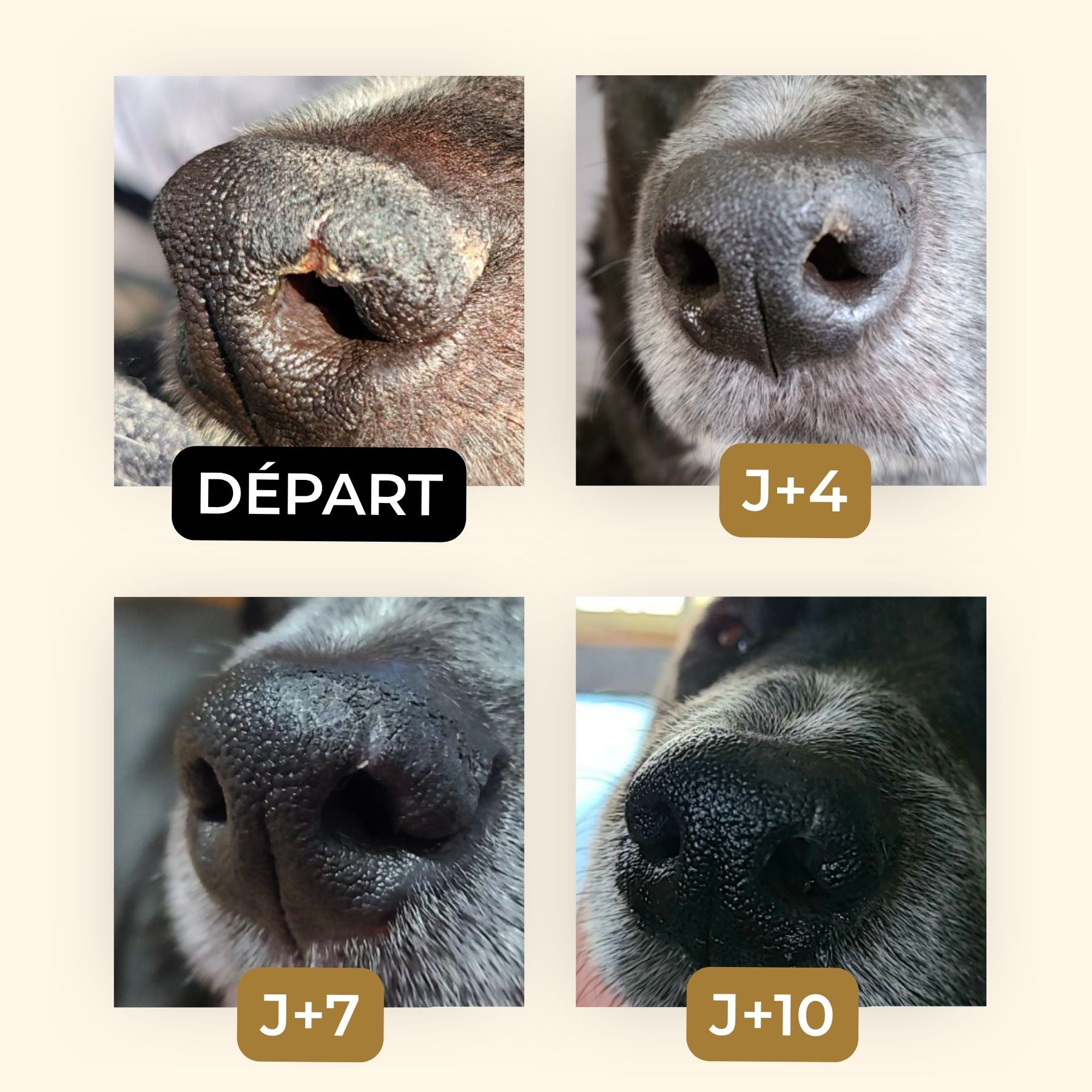 Appliquez généreusement sur la truffe de votre chien en massant pendant une petite minute afin de faire pénétrer le baume. À utiliser régulièrement en prévention de tout désagrément ou en cure.