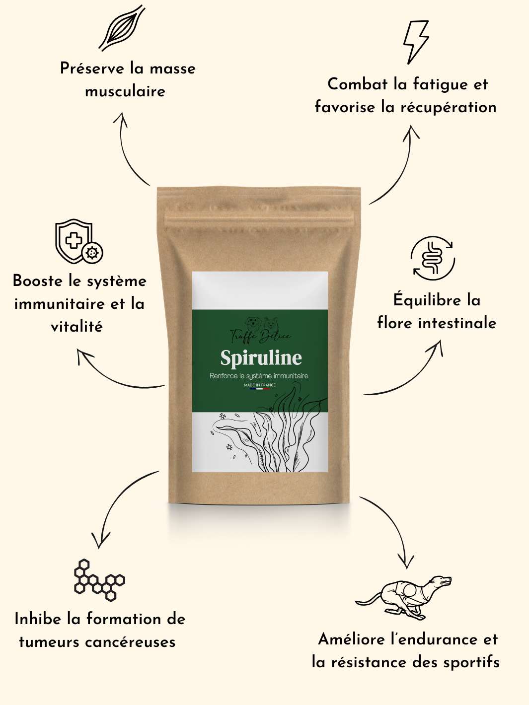 La spiruline est une microalgue de couleur verte. Elle a été citée par l’Organisation Mondiale de la Santé comme le meilleur aliment du 21e siècle. Notre complément spiruline made in France 🇫🇷 est riche en protéines, antioxydants, vitamines et minéraux ce qui améliore la santé et la vitalité de votre animal.