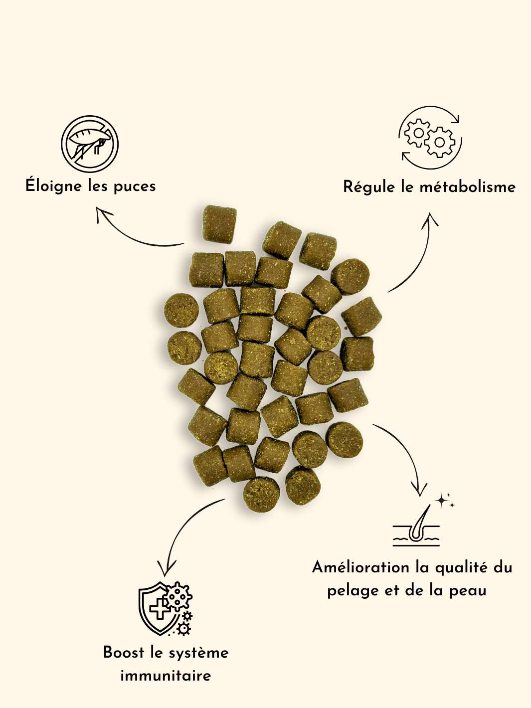 Aliment complémentaire pour chiens. Ne pas dépasser la dose conseillée. À consommer dans le cadre d'une alimentation variée et équilibrée et d'un mode de vie sain.