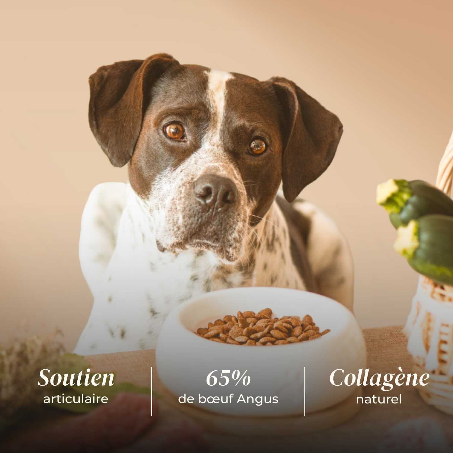 Riches en protéines (38%) de haute qualité, nos croquettes soutiennent le développement musculaire et la vitalité de votre chien. De plus, le bœuf Angus est une excellente source de collagène (14%), essentiel pour la santé des articulations et de la peau.