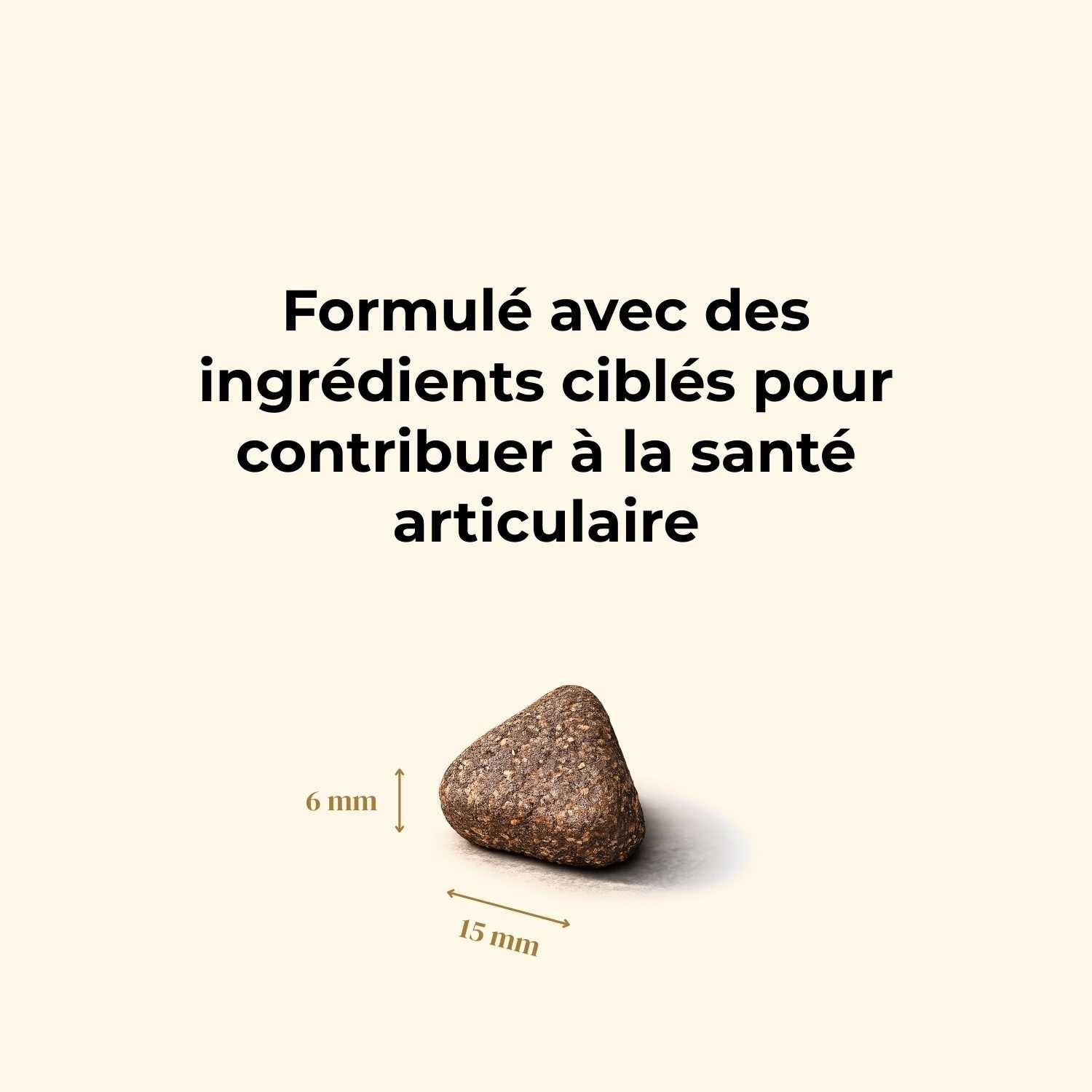 Nos croquettes pour chiens adultes font 15 x 6 mm. Elles ont été optimisées et conçues pour convenir à toutes les babines. Chaque croquette a une différence de +/- 1mm.