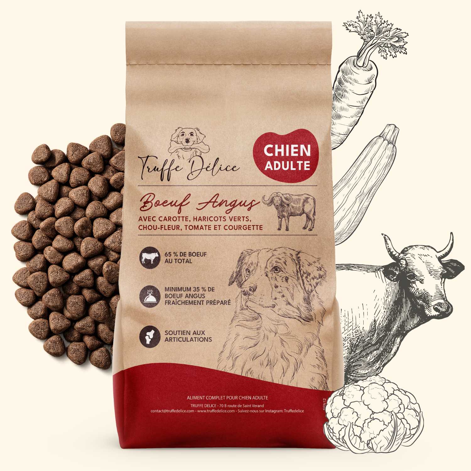 En choisissant le bœuf Angus, vous optez pour une viande d'exception, riche en protéines et en collagène, qui contribue au bien-être général et à l'énergie de votre chien.