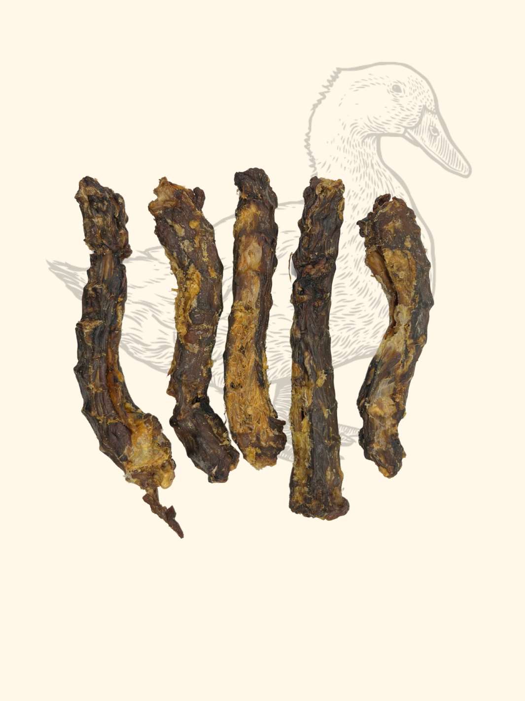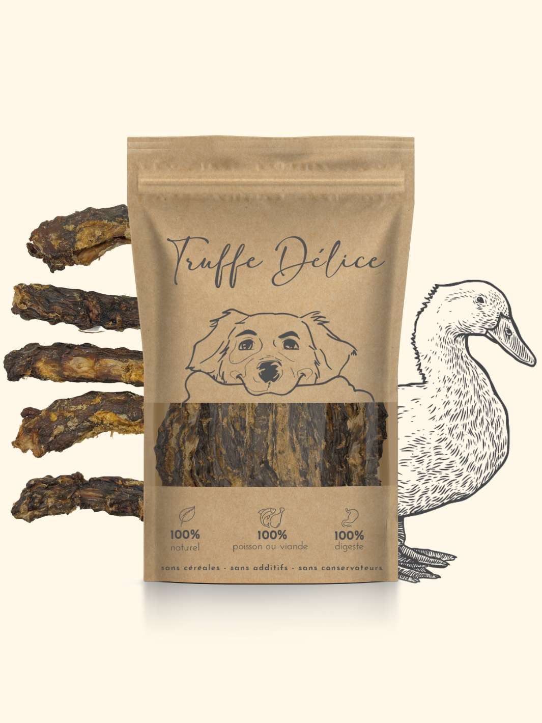 Les cous de canard sont des friandises pour chien 100% naturelles. Les cous de canard à mâcher pour chien sont des produits sains et sûrs. La texture des os du cou est plutôt cassante. Lorsqu'ils sont mâchés, les os s'écraseront, mais ne se briseront pas en objets pointus. Les cous de canard déshydratés de Truffe Délice sont entièrement digestes tout comme les pattes de poulet.