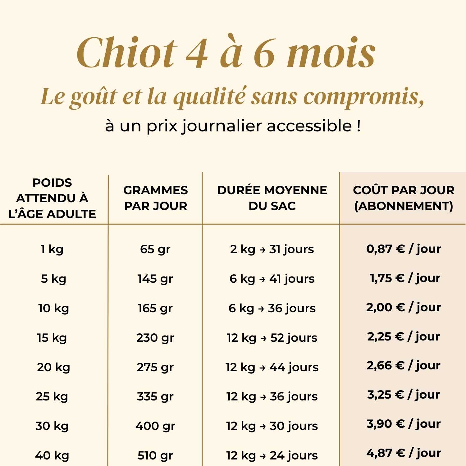 | 1 à 4 kg | 45 à 70 gr | 65 à 75 gr | 65 gr ADULTE | ADULTE |