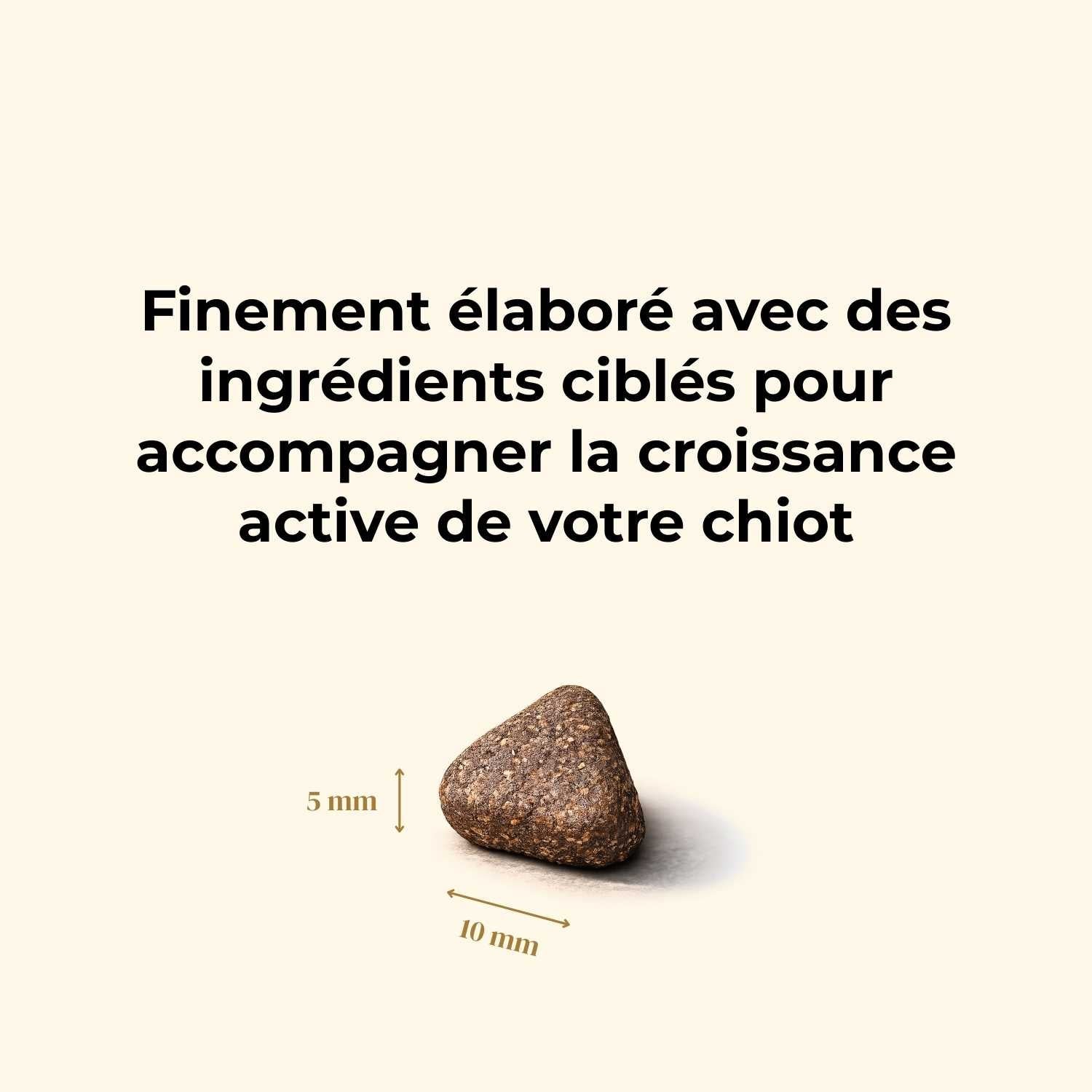 Nos croquettes, spécialement formulées pour les chiots, combinent les bienfaits de la viande de dinde et de cochon pour offrir une alimentation riche en protéines (+37 %), équilibrée et savoureuse, essentielle pour une croissance saine.